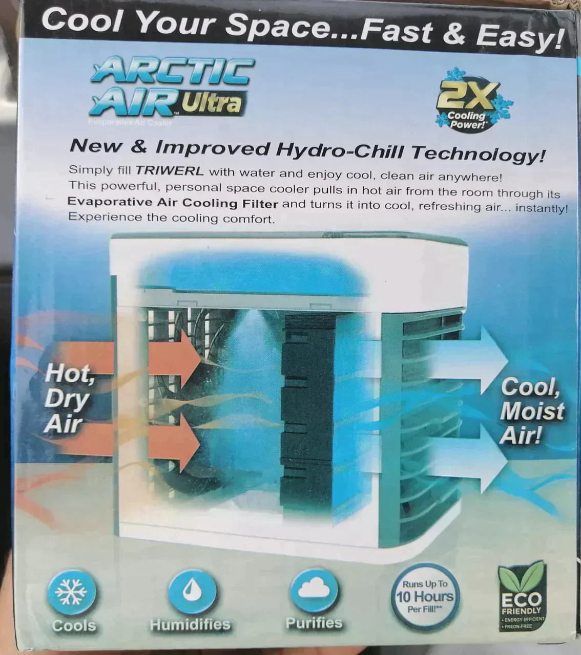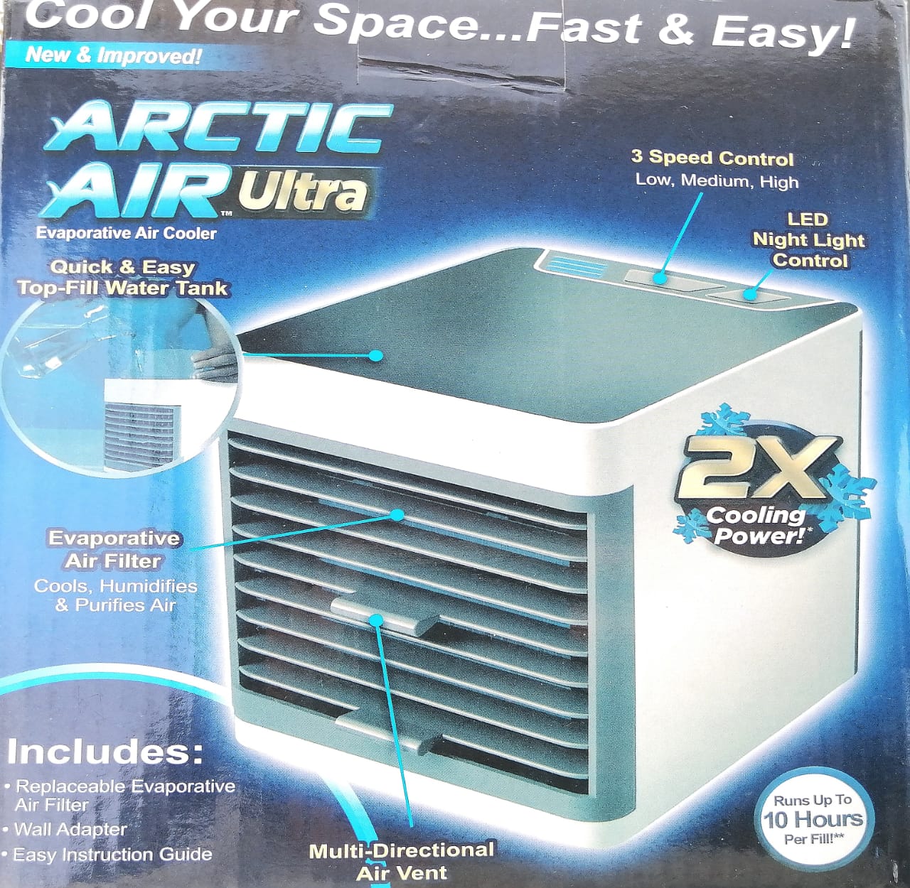 - AIR COOLER: The Arctic Air Ultra is a portable air conditioner that cools, humidifies & purifies. This personal space cooler features three fan speeds & a multi-directional air vent.