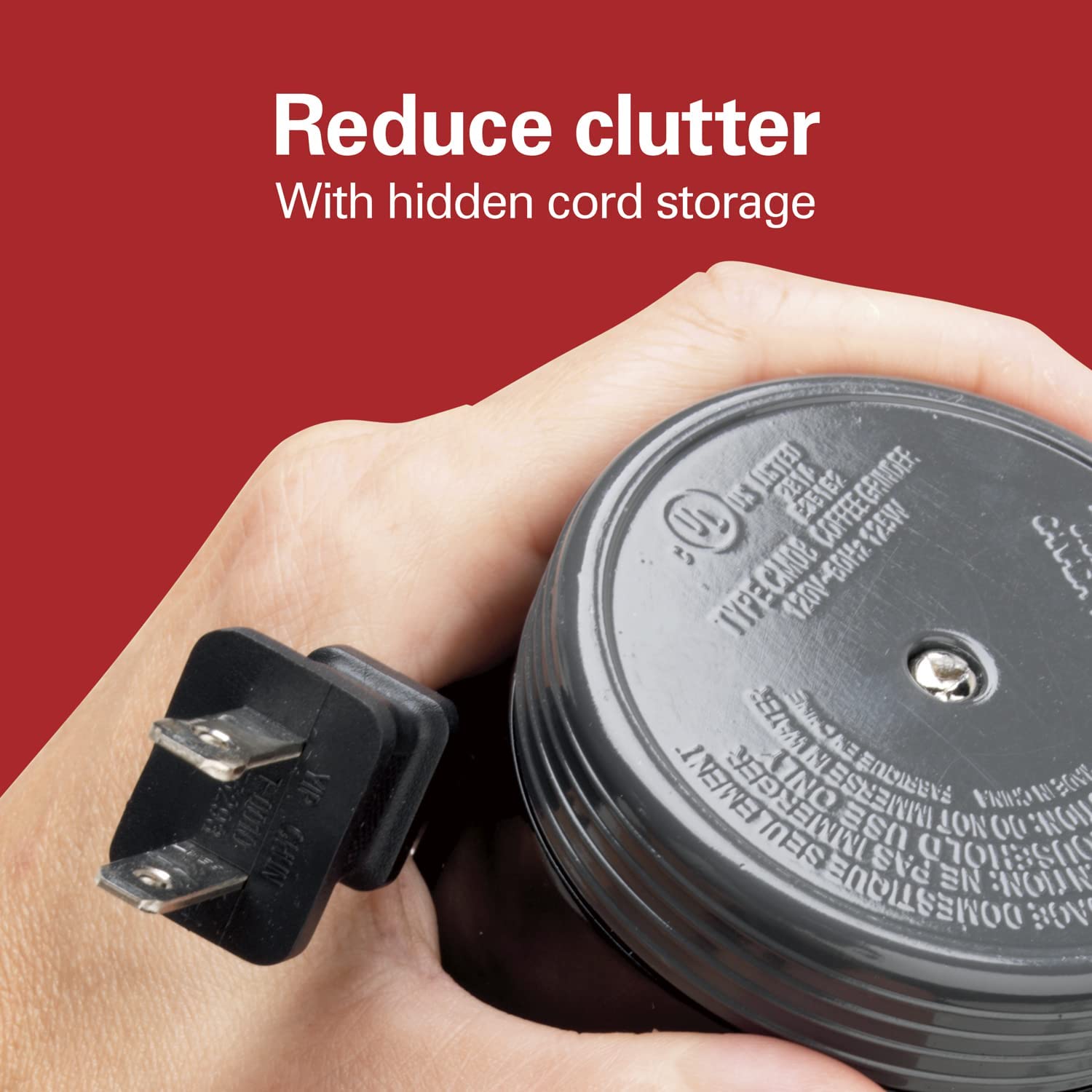 The Hamilton Beach Fresh Grind Electric Coffee Grinder combines functionality and style with its sleek black design. Its compact size fits perfectly on any countertop, while the cord storage feature keeps your kitchen neat and organized.