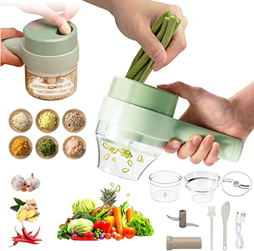 4-in-1 Electric Vegetable Slicer: Handheld Electric Vegetable Slicer Set includes 4-in-1 functions for slicing, cooking, peeling and cleaning brushes. With it, you can have an electric vegetable slicer and an electric meat grinder at the same time. One machine is multi-purpose, convenient and fast. The Handheld Electric Vegetable Cutter Set handles whole foods without pre-cutting. The portable vegetable cutting machine has a round filling hole. which can be directly inserted into long strips of ingredients such as peppers, cowpeas, and yam, eliminating the tedious steps of opening and twisting the cap. The multi-function vegetable cutter feels comfortable and breaks the hovering and click mode of the traditional electric garlic paste. The ergonomic design does not tire your hands. The vegetable cutter protects your fingers from the blade when cutting vegetables. You no longer need any slicer to cut vegetables. Skill Product Description: Colour: green Material: ABS+PP+PC+stainless steel Size: about 20.5*9.5*8cm/8*3.7*3.1in Weight: 490 grams |